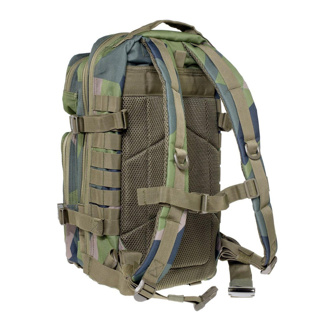 De tactische rugzak van 30 liter toont het onderscheidende Zweedse splinter M90 camouflagepatroon, waardoor effectieve verhulling biedt in buitenomgevingen. Dit camouflage -ontwerp helpt de rugzak naadloos op te gaan met zijn omgeving en biedt optimale camouflage tijdens buitenactiviteiten of tactische missies.