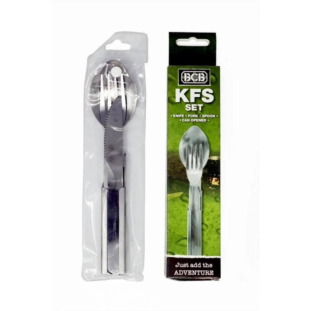- De KFS Set, met een mes, vork, lepel en blikopener, wordt een essentieel hulpmiddel voor iedereen die graag de natuur verkent. Deze set zorgt ervoor dat je probleemloos van elke maaltijd kunt genieten, of je nu kampeert, wandelt of trekking.