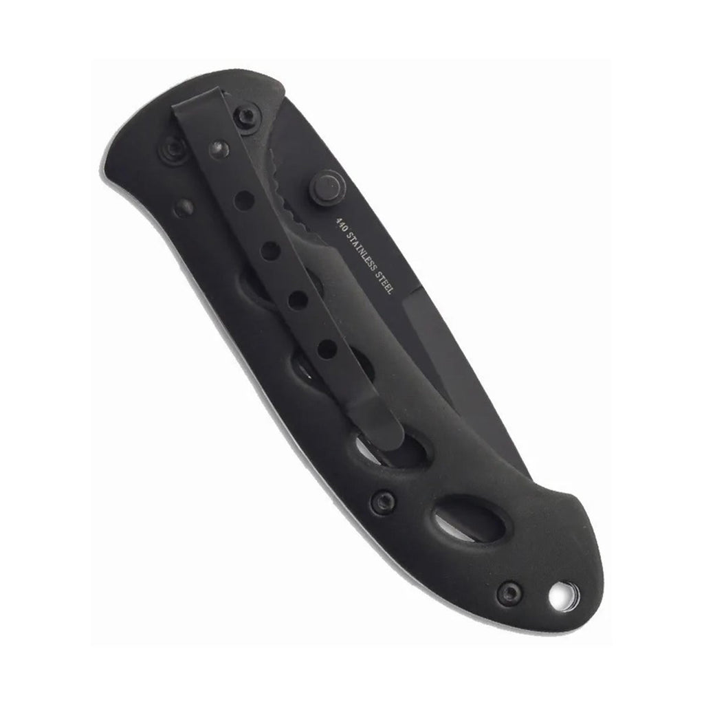 • De lichtgewicht aluminium handvat biedt een sterke maar comfortabele grip. Openingen in het handvat verminderen het gewicht zonder dat dit ten koste gaat van de sterkte. De mat zwarte coating geeft het mes een strakke, tactische uitstraling die past in elke omgeving.