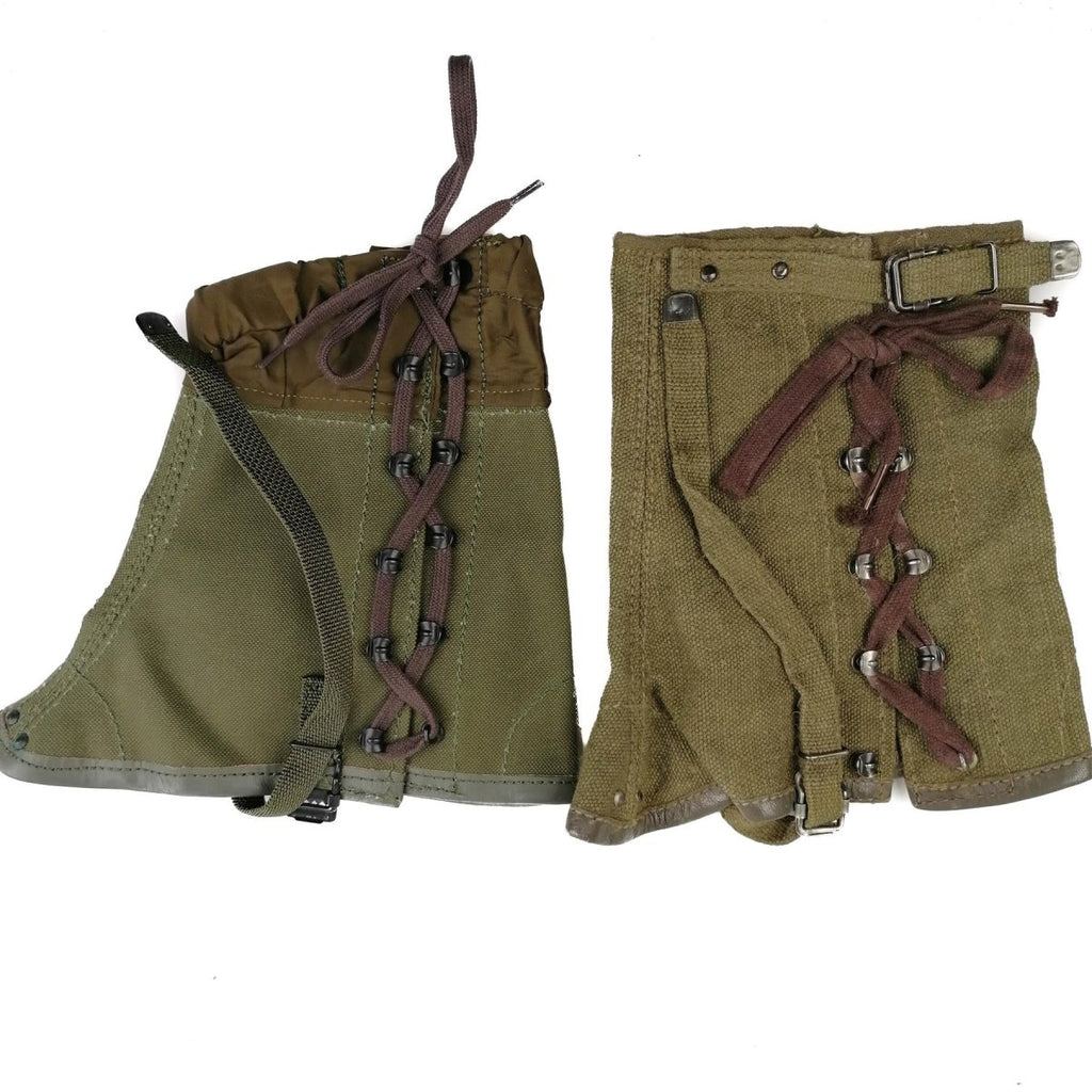 Originele vintage Italiaanse militaire canvas beenkappen in olijfkleur zijn een soort beschermende uitrusting die oorspronkelijk door het Italiaanse leger werd gebruikt. Ze zijn gemaakt van duurzaam canvasmateriaal in een olijfkleur en zijn ontworpen om de benen en voeten te beschermen tegen water, sneeuw en vuil. Deze beenkappen worden meestal aan de voorkant vastgemaakt en hebben riemen die rond de kuit en enkel gaan om ze op hun plaats te houden. Militaire canvas beenkappen worden vaak over laarzen of schoenen gedragen, waardoor ze ideaal zijn voor buitenactiviteiten zoals wandelen, jagen of kamperen. Ze hebben een vintage look en feel en worden populair onder verzamelaars en liefhebbers van militaire uitrusting.