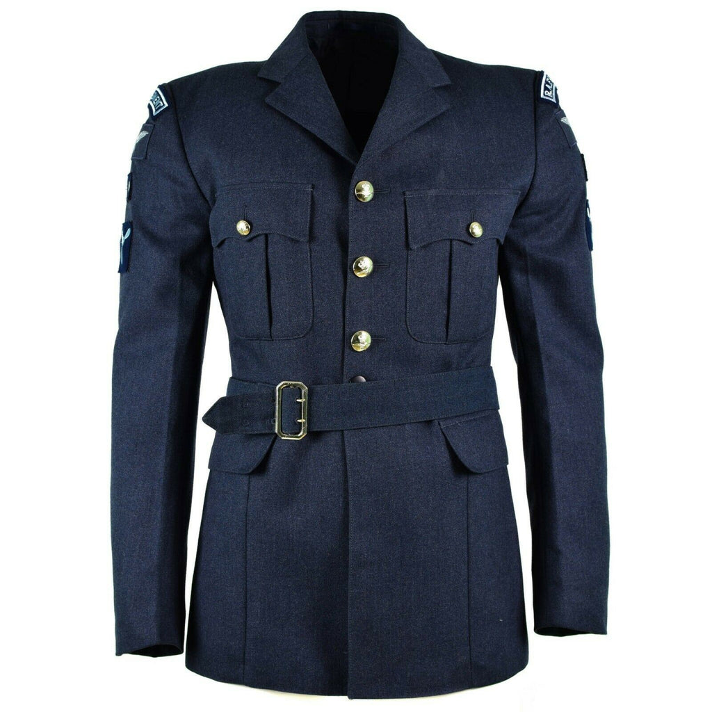 - Oorspronkelijk gedragen door de Royal Air Force (RAF), toont deze jas een formeel ontwerp met een klassiek voorste voorkant met één borsten. De goudkleurige knoppen, versierd met de RAF-insignes, voegen een verfijnde touch toe aan de algehele look.