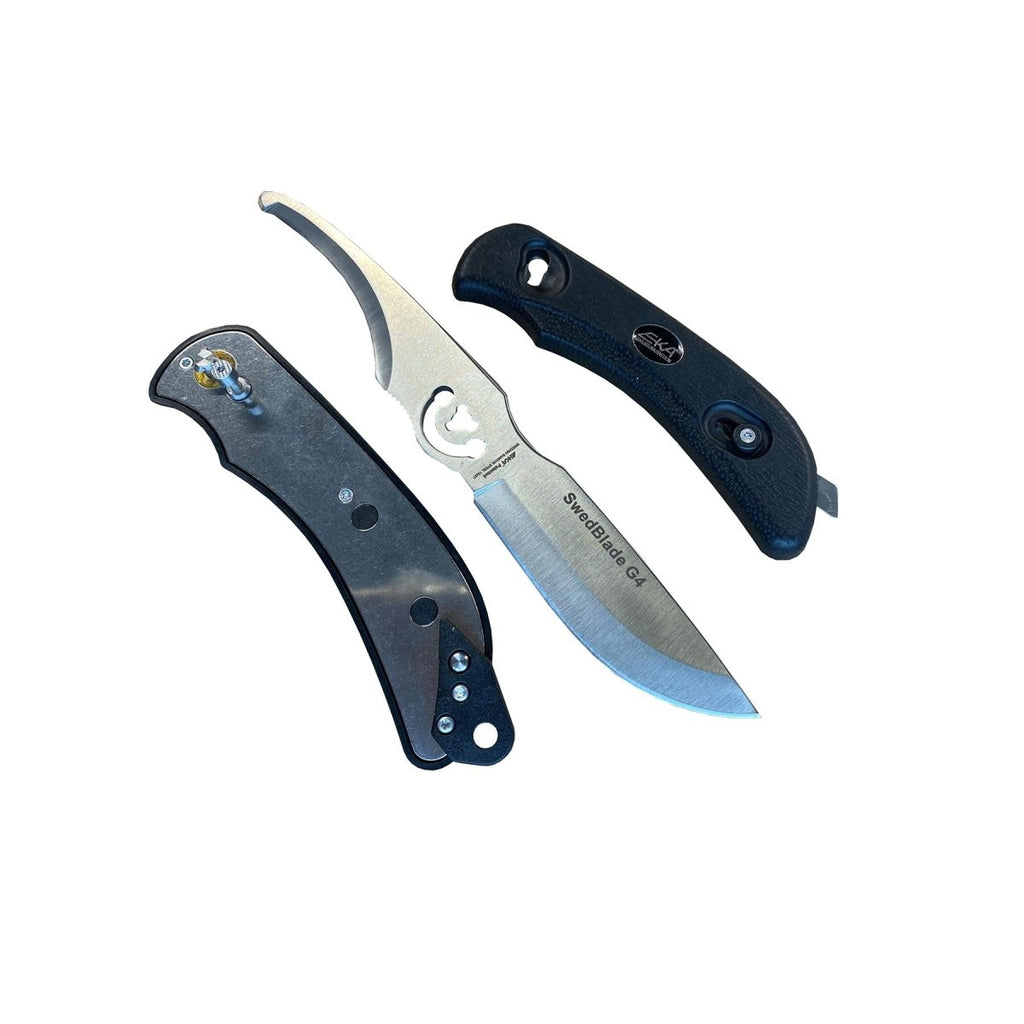 De EKA® SwedBlade G4 maakt gebruik van een beproefd, draaibaar mesontwerp met twee messen dat het gebruik en de functionaliteit van twee verschillende stijlmessen in één mes mogelijk maakt. Er zijn een heleboel geweldige eigenschappen die ervoor zorgen dat de EKA® SwedBlade G4 een uitstekend mes is. Het heeft een goed ontworpen ergonomisch gevormde handgreep. De messen zijn gemaakt uit een constructie uit één stuk van EKA-goedgekeurd hoogwaardig staal dat bijdraagt aan duurzaamheid en duurzame randen die hun scherpte behouden. Schakel snel tussen het onthuidmes en het onthuidmes met een eenvoudige, vloeiende beweging wanneer de vergrendelknop wordt ingedrukt. Eenvoudig en zonder gereedschap klik je om het mes met twee messen te demonteren/monteren, zodat je het na elk gebruik kunt reinigen. Het heeft ook een bevestigingspunt voor een sleutelkoord om uw EKA® G4 bij u te houden en waar deze moet zijn.