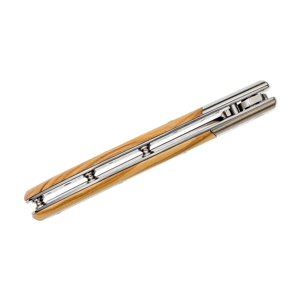 - De handvat van olijfhout toont een unieke natuurlijke korrel. Roestvrijstalen frames zorgen voor stevigheid en een gepolijste, klassieke uitstraling. Het mes combineert elegantie met duurzaamheid, waardoor het geschikt is voor zowel dagelijks gebruik als speciale gelegenheden.