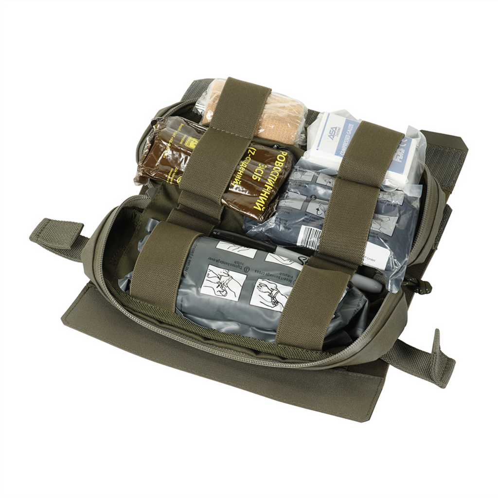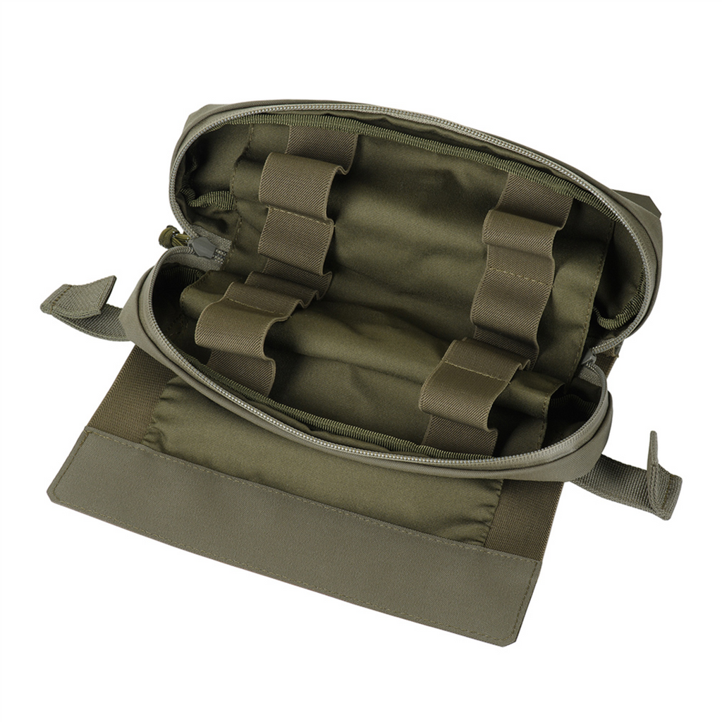 Het etui bestaat uit een buitenhoes en een uitneembaar IFAK-inzetstuk. Het inzetstuk kan snel worden verwijderd door aan de riem te trekken, waardoor snelle toegang tot medische benodigdheden mogelijk is. Binnenin bevindt zich een elastisch organizersysteem voor het veilig opbergen van EHBO-uitrusting (medische benodigdheden niet inbegrepen).