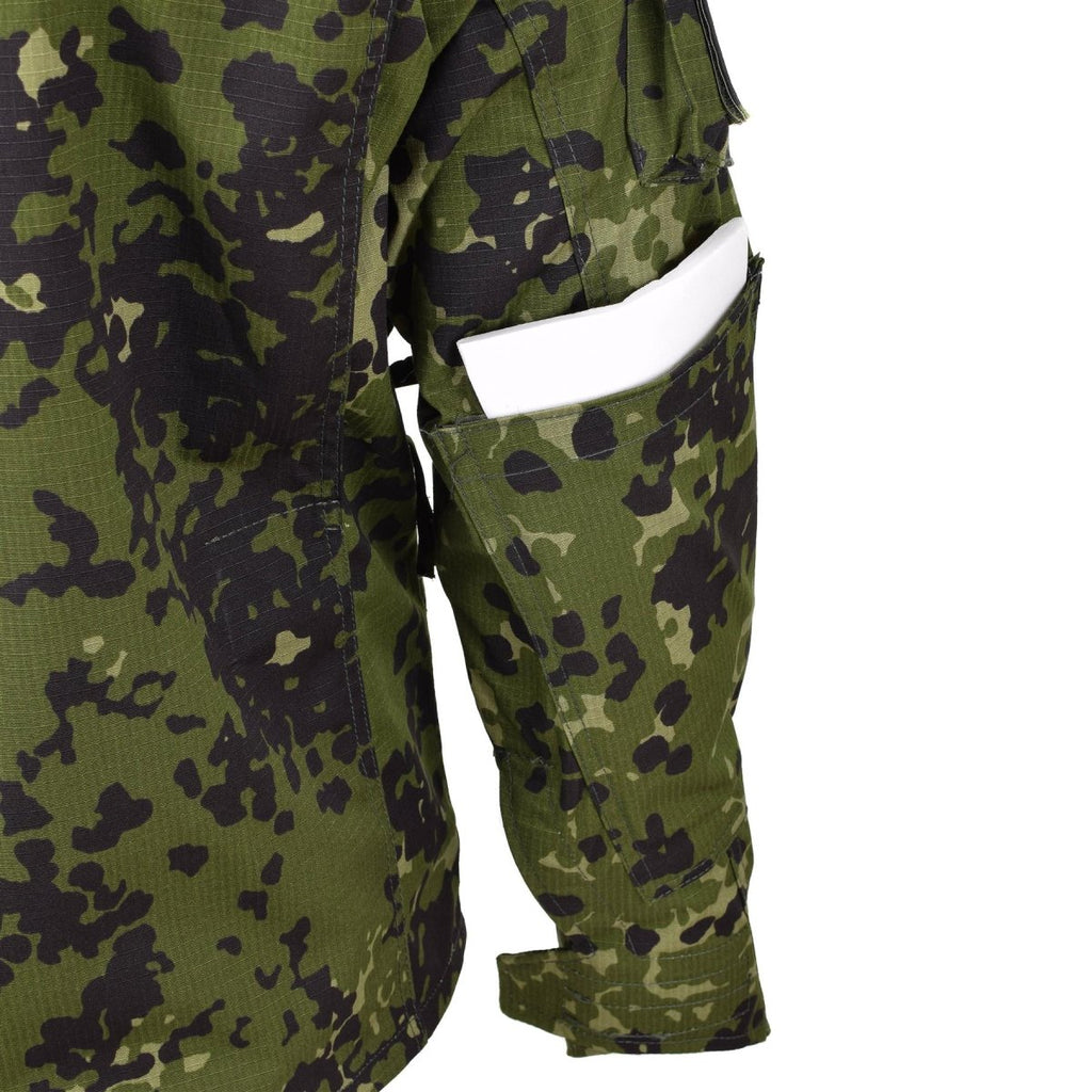 - Ten eerste heeft het M84 -gevechtshirt een onderscheidend Deens militair camouflagepatroon. Dit patroon vergroot het nut in verschillende buitenactiviteiten, zoals jagen, wandelen en kamperen. Bovendien zorgt het voorste voorste voorste voor het gemakkelijk te dragen en verwijderen, terwijl de versterkte ellebogen extra duurzaamheid en bescherming bieden.